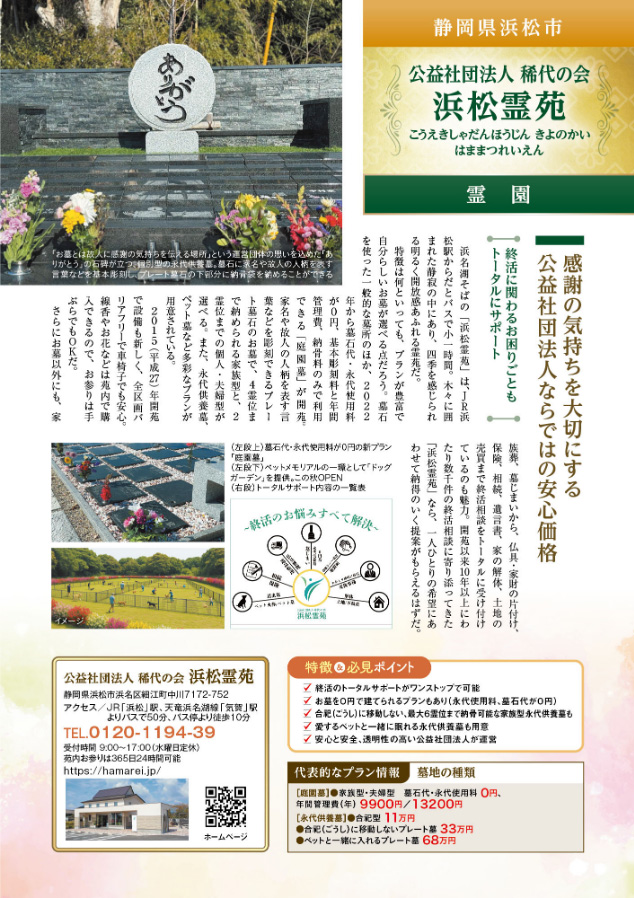 さらにお墓以外にも、家族葬、墓じまいから、仏具・家財の片付け、保険、相続、遺言書、家の解体、土地の売買まで終活相談をトータルに受け付けているものも魅力。開苑以来10年以上にわたり数千件の終活相談に寄り添ってきた「浜松霊苑」なら、一人ひとりの希望にあわせて納得のいく提案がもらえるはずだ。